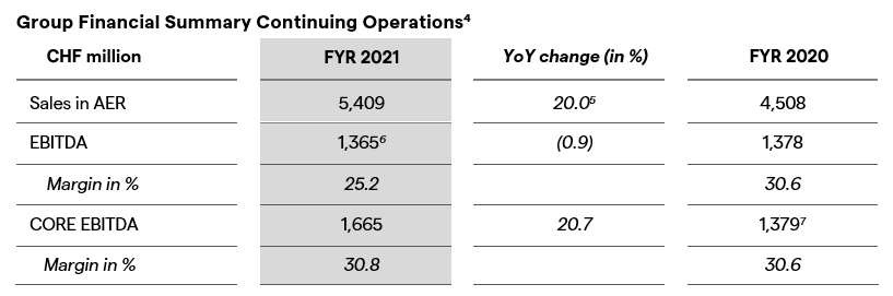 Lonza has reported sales of CHF 5.4 billion, growing 20% AER (20% CER) and CHF 1.7 billion CORE EBITDA, resulting in a margin of 30.8%. This strong momentum at Group level was driven by sales growth ahead of market across all divisions. The margin improvement was achieved through productivity improvements which were partially offset by the dilutive effect of ramping up growth projects and a negative mix. Reported EBITDA was impacted by the provision of CHF 285 million for the environmental remediation of the old Gamsenried landfill, with no impact on CORE EBITDA and cash flow. Through 2021, Lonza continued to execute its ongoing organic growth projects, as well as confirming new investments. For the Full Year, the total CAPEX reached CHF 1.3 billion or 24% of sales, and it is expected to increase to around 30% in 2022. These investments are focused on delivering the company’s long-term investment strategy to capture growth opportunities at attractive margins while minimizing risk. This level of investment was supported by free cash flow, alongside the proceeds from the divestment of Lonza’s former Specialty Ingredients business. The company’s internal growth investments were accompanied by a selective approach to bolt-on acquisitions. Lonza’s new exosomes sites in Lexington (US) and Siena (IT) have expanded its offering in this important emerging area, reflecting its focus on differentiating through innovation. As well as investing for the future, Lonza also continued to successfully navigate global supply disruptions arising from the COVID-19 pandemic with manageable impact for its customers and growth projects. Although disruptions look set to continue into 2022, no material impact is anticipated as long as the conditions remain comparable with the previous two years. Through the year, the business has continued to strengthen its balanced portfolio of customer collaborations with approximately 170 new CDMO customers2 signed in 2021, alongside more than 400 new clinical and commercial programs. Looking to the year ahead, Lonza’s Outlook for Full-Year 2022 remains strong, with low to mid-teens CER sales growth anticipated. Business momentum across divisions and ramp-up of growth projects will drive expansion at above-market levels. A continuing focus on operational excellence is expected to deliver an improved CORE EBITDA margin in line with the 2024 Mid-Term Guidance trajectory. Lonza also reconfirms its 2024 Mid-Term Guidance. Pierre-Alain Ruffieux, CEO, Lonza commented: “In 2021, we remained resilient to the challenges of the pandemic. We achieved a strong business performance across our four divisions, thanks to the commitment of our dedicated employee community. We continue to meet our customers’ most pressing needs by accelerating growth in areas of sustained high margin and market demand. Looking to 2022, we will continue to maintain momentum in our organic investments to expand our global capacities and service offering while focusing on operational excellence. We are also continuing to drive forward our sustainability agenda. All of this will allow us to deliver sustained growth across our divisions. In this context, we are confident the building blocks are in place to deliver on our 2022 Outlook and our 2024 Mid-Term Guidance.” Divisional Overview